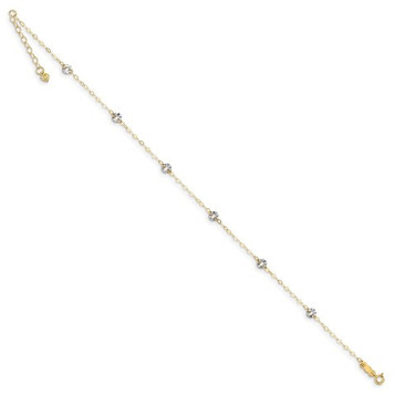 Jewelry Type: AnkletsAnklet Type: Anklets with Stations Material: Primary: Gold Material: Primary - Color: Two-Tone Material: Primary - Purity: 14K Finish: Polished Chain Length: 9 in Chain Width: 1 mm Clasp /Connector: Spring Ring Extender Length: 1 in Feature(1): Adjustable Manufacturing Process: Casted