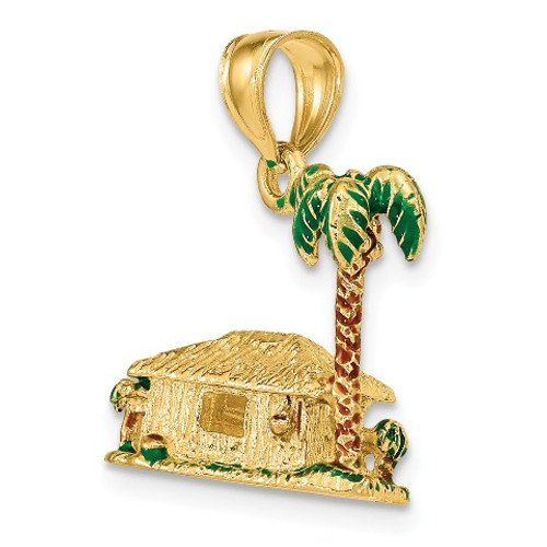 14K Yellow Gold 3-D With Enamel Palm Tree & Hut Charm Pendant - (A91-297)