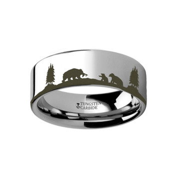 Animal Landscape Scene Wolf Wolves Ring Engraved Flat Black Tungsten Ring - 4mm - 12mm