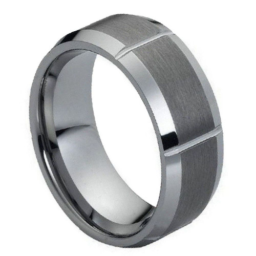Tungsten Ring Brushed Flat Top and Vertical Grooves Beveled Edges 9mm Wedding Band