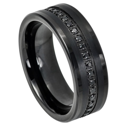 Black Tungsten Ring with Black CZ set in Center Groove and Polished Edges 8mm Wedding Band