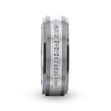 BOND Titanium 9 Channel Set White Diamonds Silver Inlaid Wedding Ring - Flat Brushed Comfort Fit - 8mm
