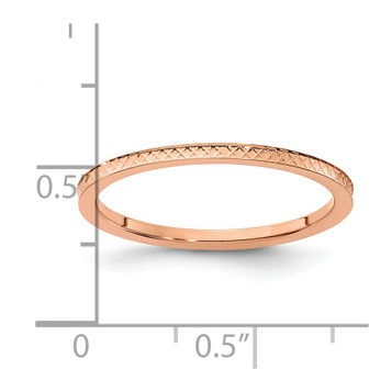 Choose Options Quick view Roy Rose Jewelry 10K Rose Gold 1.2mm Width - 4.5mm - 10mm Size - Criss-Cross Pattern Stackable Band Material: Primary - Purity:10KFinish:PolishedFeature:SolidMaterial: Primary:GoldRing Fit:StandardSizeable:YesProduct Type:JewelryJewelry Type:RingsSold By Unit:EachTexture:TexturedMaterial: Primary -... MSRP: $219.97 - $239.97 Choose Options Compare