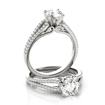 The highlight of this ring is the intricate pave diamond detailing on the side of the band, adding a touch of brilliance and sophistication. The center stone options for this engagement ring are equally impressive. You can opt for an IGI certified lab grown diamond, known for its exceptional quality and ethical sourcing. These lab grown diamonds are available in clarity grades of VVS or VS, ensuring utmost clarity and brilliance. Alternatively, you can choose a GRA certified moissanite gemstone, known for its stunning fire and brilliance. These moissanite gemstones are available in a clarity grade of VVS1 with a D-E color grade.