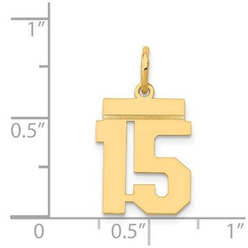 Choose Options Quick view 14k Yellow Gold Small Polished Number 15 Charm Pendant - (A86-505) JEWELRY SPECIFICATIONS and Additional InformationPurity:14KFinish:PolishedMaterial: Primary:GoldProduct Type:JewelryJewelry Type:Pendants & CharmsSold By Unit:EachPendant/Charm Type:Letter/NumberColor:YellowRelative Size:SmallNumber:15Sold by Roy Rose... MSRP: $430.97 $339.97 Choose Options Compare