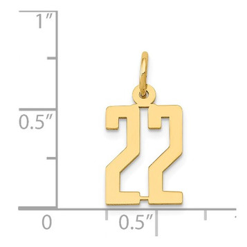 JEWELRY SPECIFICATIONS and Additional InformationPurity:14KFinish:PolishedMaterial: Primary:GoldProduct Type:JewelryJewelry Type:Pendants & CharmsSold By Unit:EachPendant/Charm Type:Letter/NumberColor:YellowRelative Size:SmallNumber:22Sold by Roy Rose...