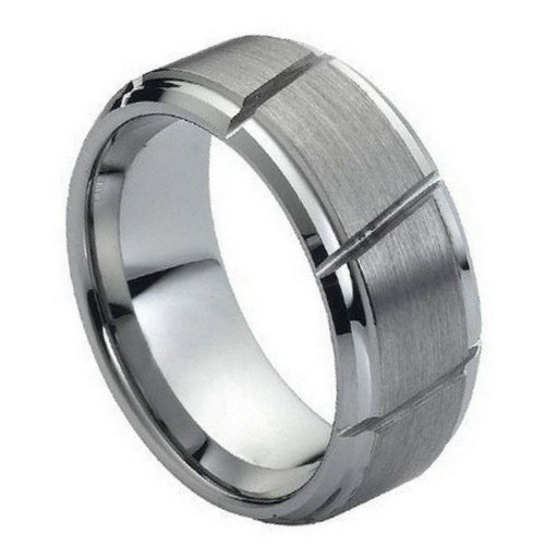 Tungsten Ring Brushed Finish with Diagonal Cut Grooves Stepdown Edges 9mm Wedding Band