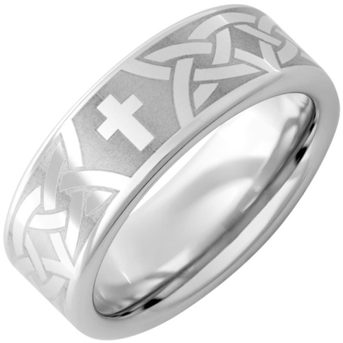 Serinium® Pipe Cut 8mm Wedding Band with Cross and Celtic Knot Design Laser Engraving